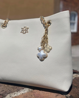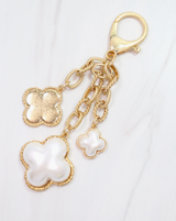 Elevate your bag game with our Jasmine Clover Bag Charm in Worn Gold. This chic accessory features a large lobster hook and a worn gold chain adorned with two pearl clover charms and one hammered gold clover charm. A fun and must-have addition to your bag, perfect for changing up your look effortlessly. Can also be used as a keychain.